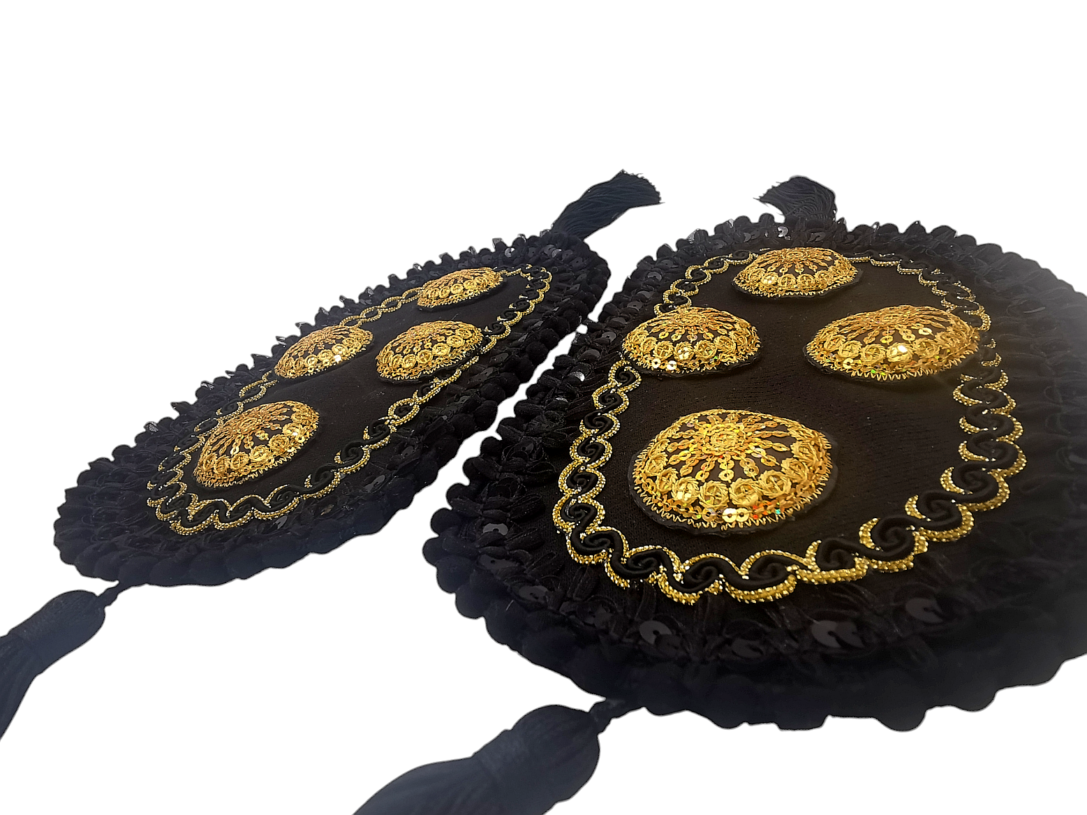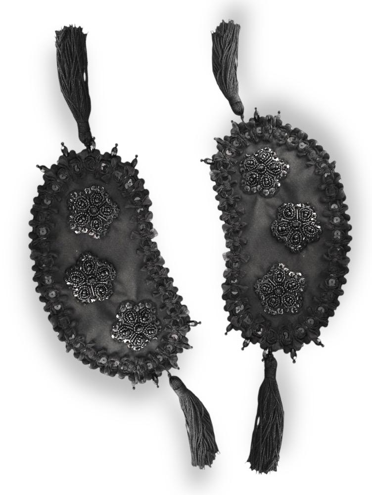Par de hombreras en azabache con la forma que recuerda a las hombreras de los trajes de luces. Decoradas con pasamanerías y cazoletas bordadas en negro y oro. Rematadas con borlas.